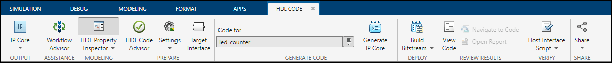You can verify your generated IP core on the hardware by using the MATLAB host interface script. This script contains MATLAB commands that connect your hardware and interact with your IP core. To generate a host interface script file, in the Simulink Toolstrip, in the HDL Code tab, select Host Interface Script > Host Interface Script.