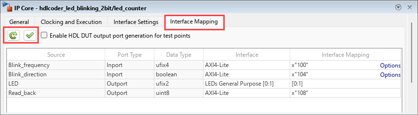 6. The registers mapped to the DUT inports, Blink_frequency and Blink_direction, are write registers. If you want to read the values stored in the write registers by using devmem, open the Interface Settings tab and select Enable readback on write registers check box. For more information, see Get Started with IP Core Generation from Simulink Model.