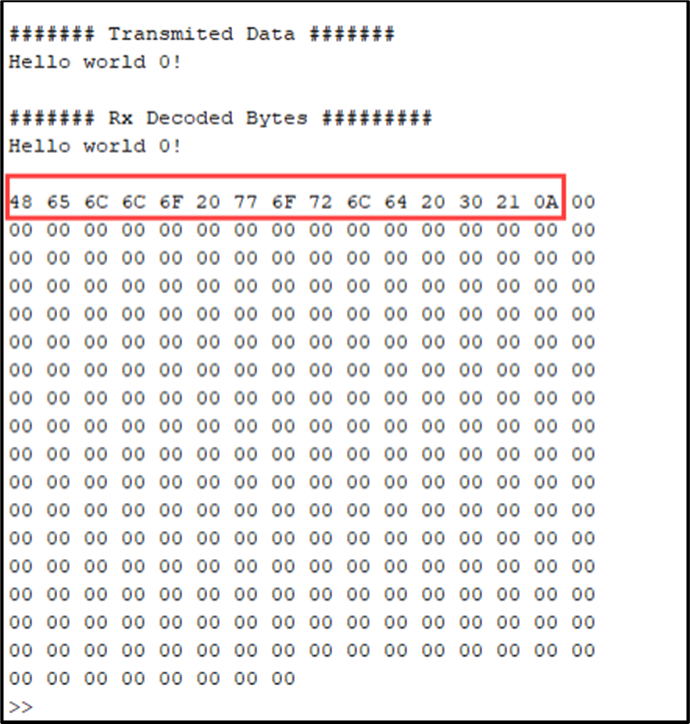 fprintf('\n') fprintf('####### Transmited Data #######\n') msgNum = 0; msg = sprintf('Hello world %d!\n',msgNum); % Format Tx payload data txDataBytes = uint8(zeros([1 dataBytesPerPacket])); txDataBytes(1:length(msg)) = msg; txDataU32 = typecast(txDataBytes,'uint32'); pause(0.1); %% AXI4-Stream Read writePort(hFPGA, "mm2sData", txDataU32);