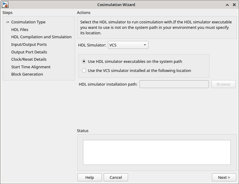 Select Use HDL simulator executables on the system path if the HDL simulator executables appear on your system path. If these executables do not appear on the path, select Use the VCS simulator installed at the following location, and then click Browse to specify the location of these executables.