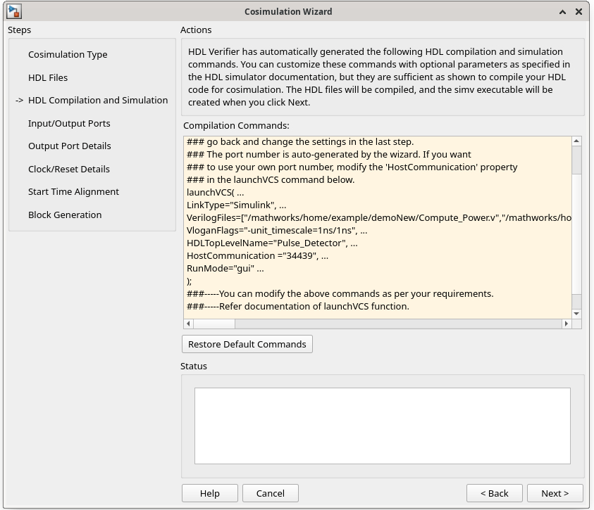 In the HDL Compilation and Simulation pane, the Cosimulation Wizard lists the default commands in the Compilation Commands window. You do not need to change these commands for this tutorial.