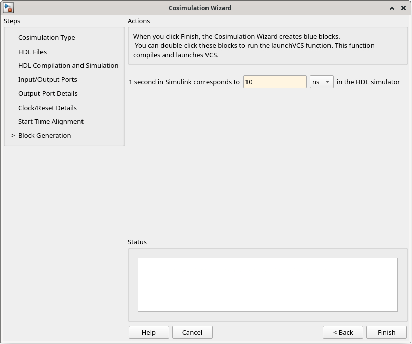 In the Block Generation pane, set the timescale by setting the 1 second in Simulink corresponds to 10