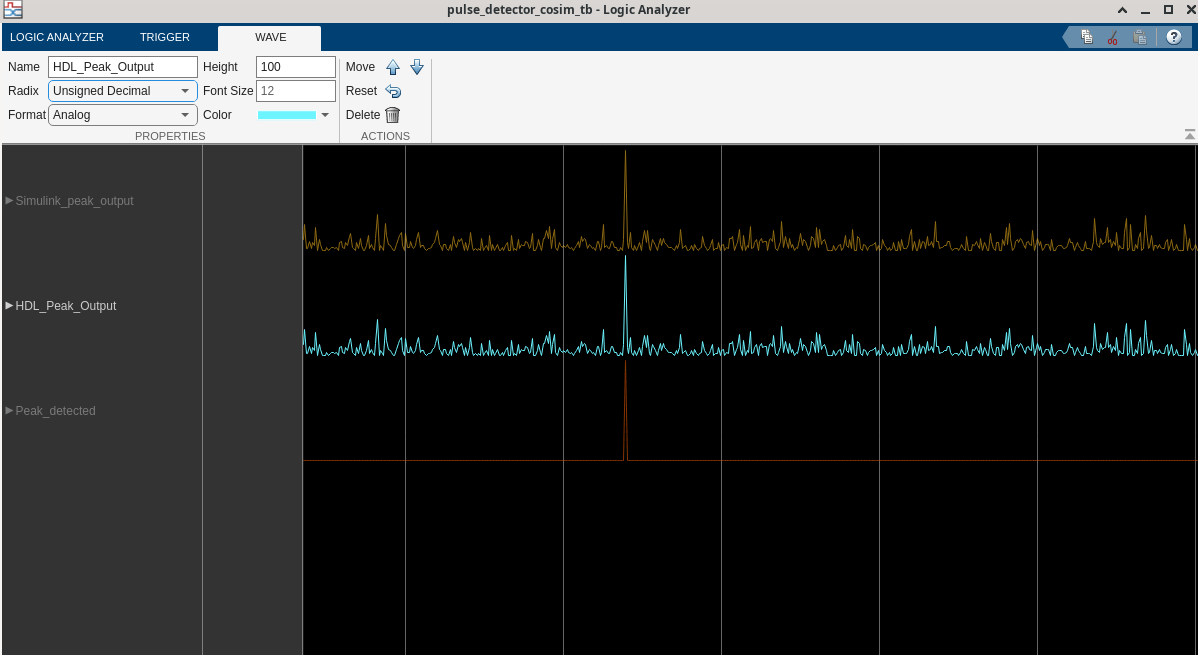Observe that the Simulink peak output coincides with the peak of the pulse detector implemented using HDL.