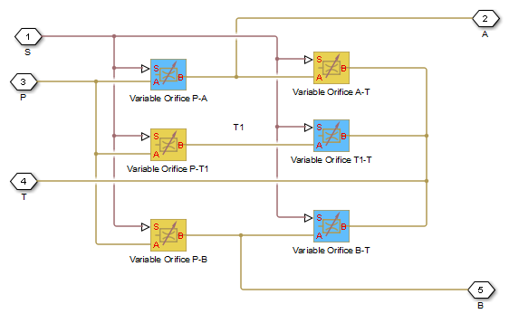 The 4-Way Directional Valve A block simulates a configuration of hydraulic continuous 4-way directional valve where the valve unloads the pump in neutral position. The fluid is pumped in the valve through the inlet line P and is distributed between two outside hydraulic lines A and B (usually connected to a double-acting actuator) and the return line T. The block has four hydraulic connections, corresponding to inlet port (P), actuator ports (A and B), and return port (T), and one physical signal port connection (S), which controls the spool position. The block is built of six Variable Orifice blocks, connected as shown in the following diagram.