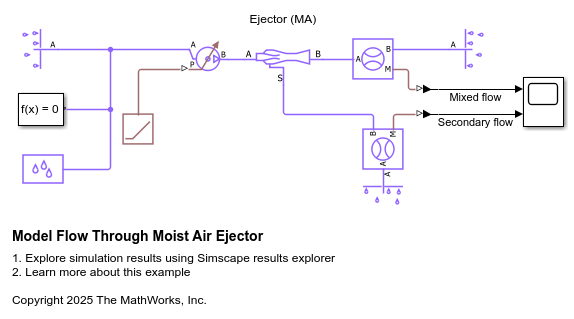 In the ejector, the primary flow that enters at port A creates a low-pressure jet that pulls in the secondary flow through port S. The mixed flow exits at port B. In this model, the secondary flow becomes choked and reaches its maximum mass flow rate.