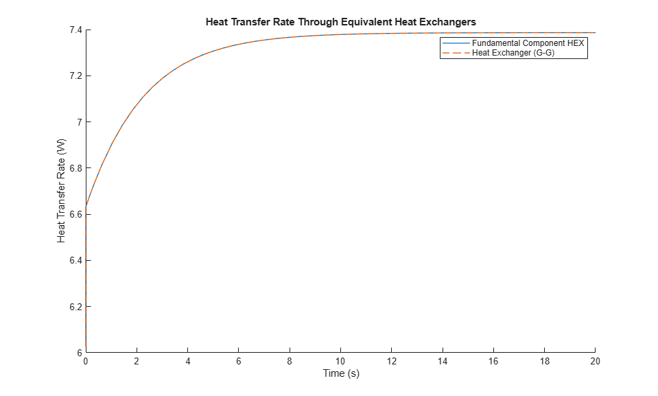 The Heat Exchanger Interface (G) block models thermal transfer by a gaseous flow within a heat exchanger. Use a second heat exchanger block to model the fluid pair. The interfaces can be in different fluid domains, such as one in liquid and one in gas. Use an E-NTU Heat Transfer block to couple the interfaces and capture the heat exchange between the fluids.