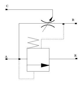 The Pressure-Compensated 3-Way Flow Control Valve block represents a 3-way pressure-compensated flow control valve as a data-sheet-based model. The valve model includes a variable orifice and a normally closed pressure-control valve, connected in parallel with the orifice. The purpose of the pressure-control valve is to maintain a preset pressure differential across the orifice by diverting some flow from port A to the tank (port R) if the pressure differential exceeds the preset value. Port C controls the orifice opening, as shown in the following figure.