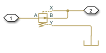 This block is a composite component with a Pressure Compensator block connected as follows: its sensor port X connected to its outlet (port B) and its sensor port Y connected to a hydraulic reference. The hydraulic reference is by definition at atmospheric pressure as defined for the entire hydraulic network. For detailed block calculations see the Pressure Compensator block (noting that quantities at port X are defined at port B and those at port Y are defined at reference conditions).