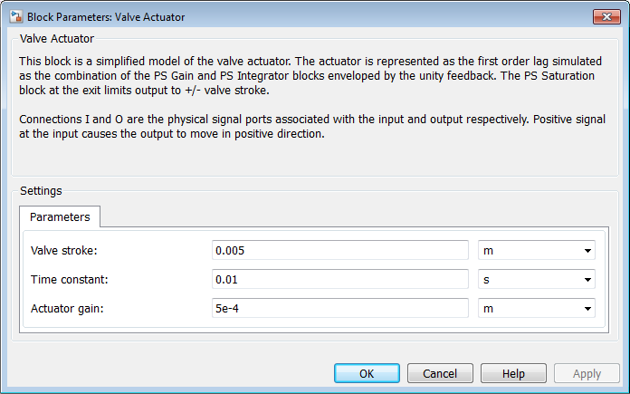 The desired valve stroke, which defines the saturation level of the PS Saturation block in the actuator model. The output of the actuator is kept within the +/– valve stroke range. The default value is 0.005 m.