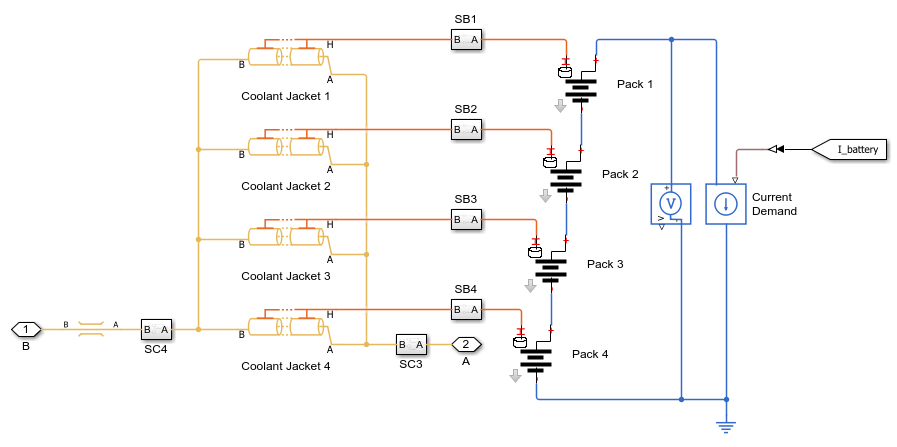 Each battery pack model contains a stack of lithium-ion cells coupled with a thermal model. The power losses in the cells correspond to the generated heat.