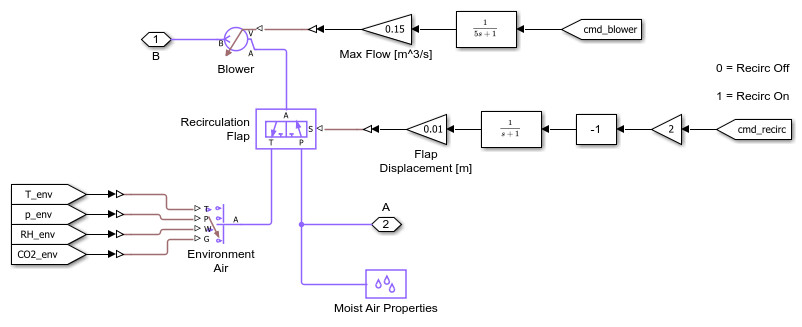 The blower drives the air flow in the cabin HVAC loop. It is controlled to maintain the cabin temperature setpoint. The source of air can come from the environment or from recirculated cabin air.
