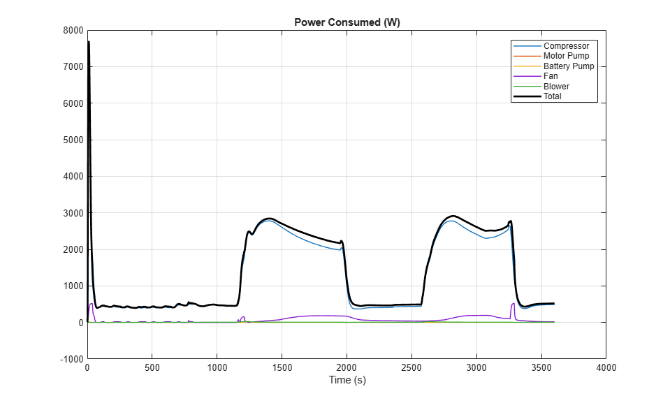 This plot shows the power consumed by the thermal management system to cool the vehicle components and cabin. The largest power consumption occurs in the refrigerant compressor when the chiller expansion valve opens to allow the chiller to cool the batteries.