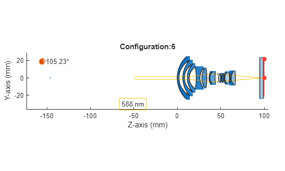 Create an intermediate configuration for the specified zoom level using the applyConfiguration helper function, provided at the end of this example. Visualize the optical system for the intermediate zoom level.