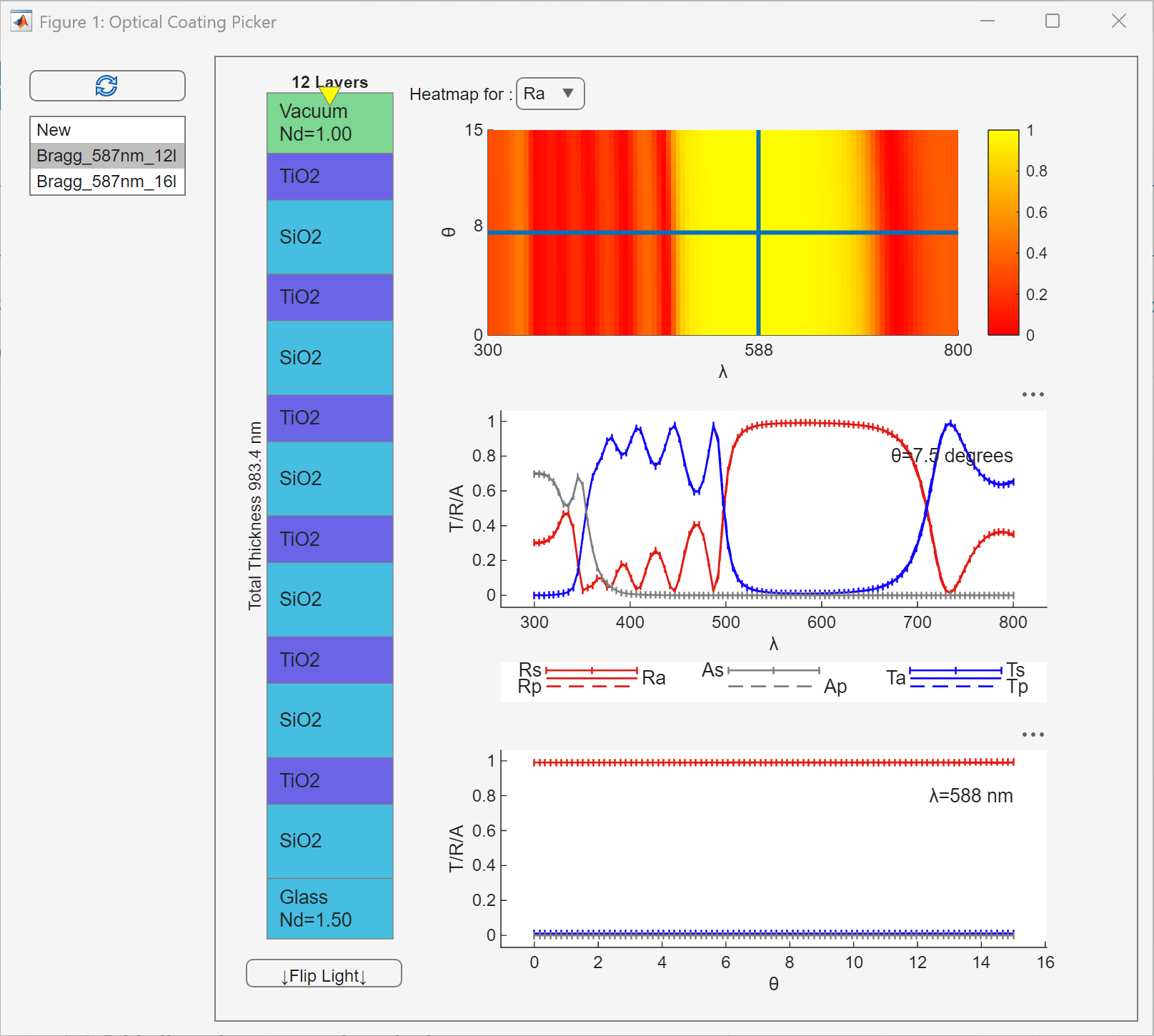 | View the schematic of the layer stack in the coating, including the layer names and thicknesses. The order of the layers places the substrate at the bottom and the medium at the top. Press the Flip Light button to flip the incident light direction. |