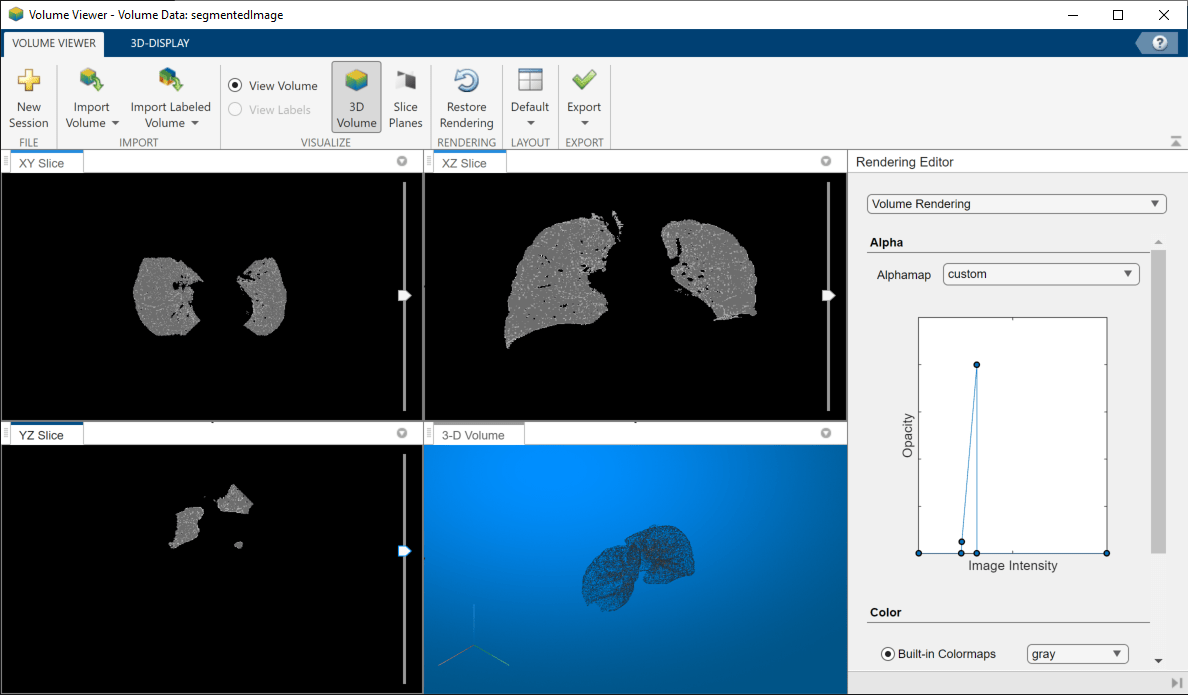 Active contours is a region growing algorithm that requires initial seed points. The example uses the Image Segmenter app to create this seed mask by segmenting two orthogonal 2-D slices, one in the XY plane and the other in the XZ plane. The example then inserts these two segmentations into a 3-D mask. The example passes this mask to the activecontour function to create a 3-D segmentation of the lungs in the chest cavity. (This example uses the active contour method but you could use other segmentation techniques to accomplish the same goal, such as flood-fill.)