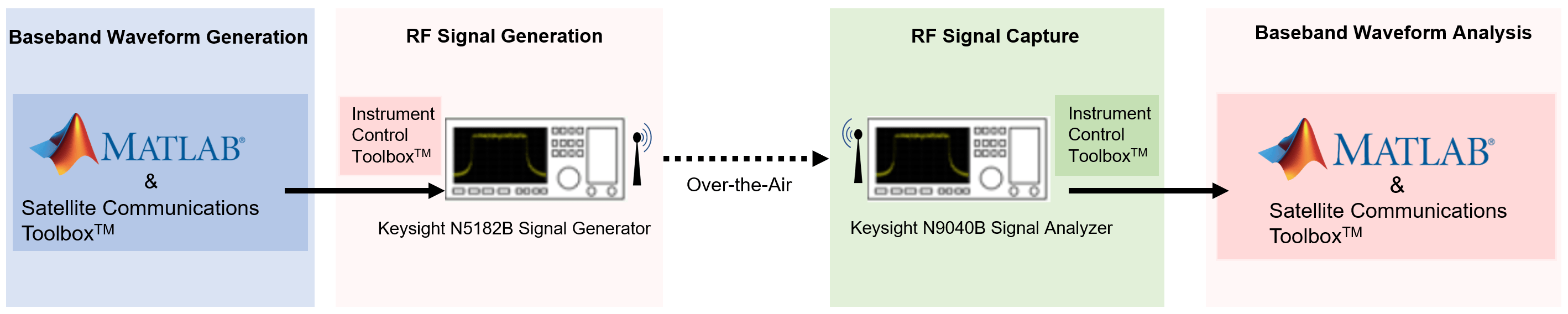 This example generates a DVB-S2 baseband waveform using the Wireless Waveform Generator app, downloads the waveform onto a Keysight vector signal generator, and transmits it over the air using the Instrument Control Toolbox. A Keysight signal analyzer then captures the data corrupted by over-the-air transmission at a sample rate of 4 Msps, after which baseband waveform analysis is performed.