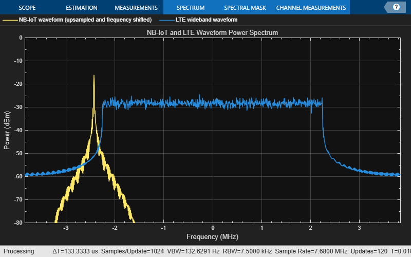 filteredSpecPlot = spectrumAnalyzer('SampleRate',lteInfo.SamplingRate,'Title','Original and Recovered NB-IoT Waveform Power Spectrum', ... 'ChannelNames',{'Original NB-IoT waveform','Recovered NB-IoT waveform'},'ShowLegend',true); filteredSpecPlot([nbiotWaveform,rxwave]);