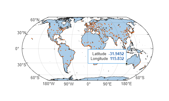 NumPointsproperty of each shape object is1. In this case, the data tips contain the latitude and longitude coordinates of the data points.