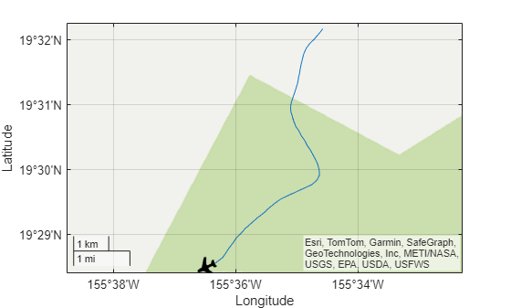 ic = geoiconchart(lat1,lon1,"uav.png");Animate the icon. For each additional point in the path: