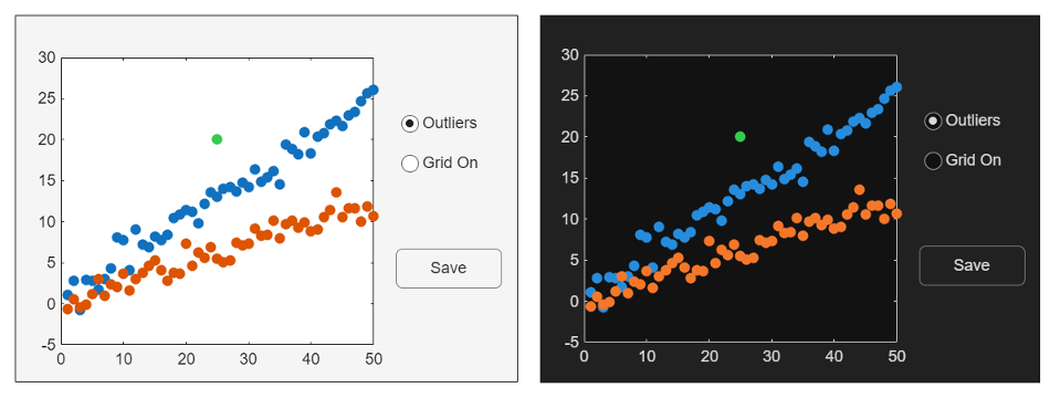 If you specify an object’s color value explicitly, MATLAB does not update the color value if the theme changes. Instead, it preserves that value regardless of the theme. For example, the following image shows an app that uses the default color values for all the objects in the figure except for the green marker in the plot, which is explicitly set. Notice that the (default) blue- and orange-colored markers in the dark-themed figure have a similar hue to the markers in the light-themed figure, but they are slightly brighter. Also, the colors of the text and axes lines are different for each theme. These changes help to maintain consistency and preserve visibility. By contrast, the color value for the green marker is the same in both figures because that color was explicitly set.