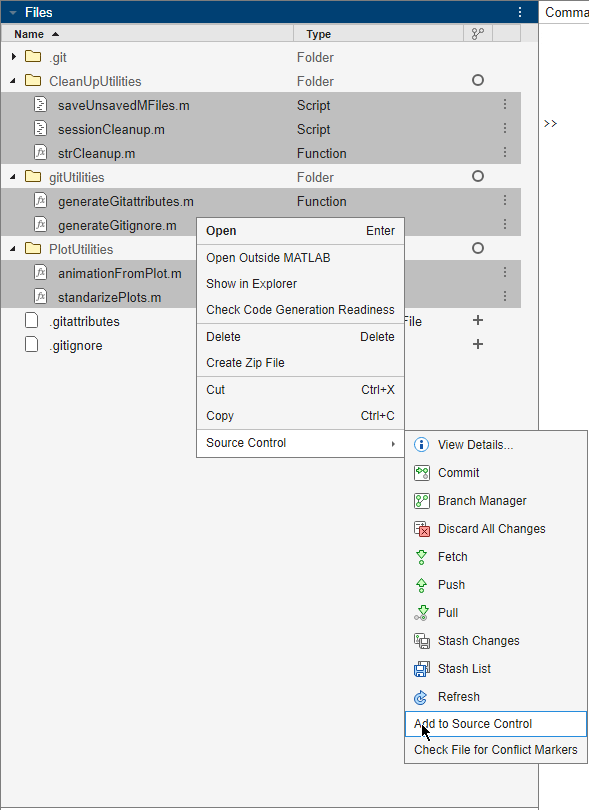 To initialize a local Git repository in a folder or project, in the Files or Project panel, right-click and select Initialize Git Repository. MATLAB® creates the .gitignore and .gitattributes files and adds them to the repository.
