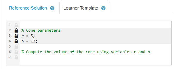 선택적으로, 학습자를 위해 시작 코드가 포함된 템플릿을 제공합니다. 자물쇠 아이콘을 클릭하여 학습자가 수정할 수 없도록 코드 라인을 잠글 수 있습니다. 예를 들어 다음 학습자 템플릿에는 원뿔 파라미터를 설정하는 주석 라인과 코드 라인은 잠겨 있습니다.