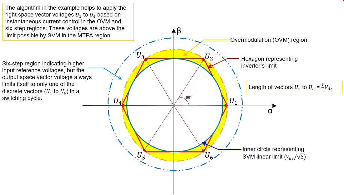 The six-step control algorithm in the example allows you to utilize the maximum possible voltage that can be drawn from the Inverter.