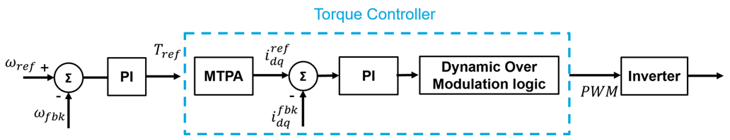This example defines a unified control strategy that achieves a seamless transition from linear Space Vector Modulation (SVM) through the overmodulation (OVM) region up to full six-step operation, thereby extracting the maximum physical voltage potential from the inverter hardware. Unlike traditional methods, the proposed approach maintains continuous instantaneous current control within a single FOC framework, eliminating the need for mode-switching algorithms. By effectively managing controller saturation and bandwidth, the system ensures stable operation even when the voltage vector is clamped to the inverter hexagon boundary.
