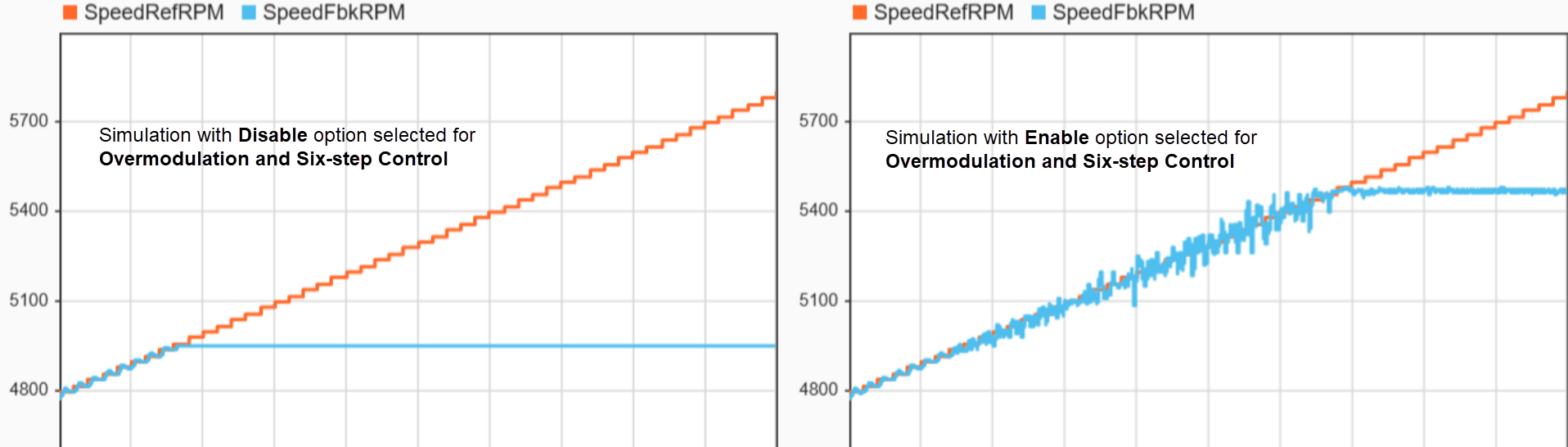 To do a comparison, you can obtain simulation results with only FOC by selecting the Disable option corresponding to Overmodulation and Six-step control in the Simulation Input and Status area in the model. In such a simulation, the output speed maintains a constant value that corresponds to SVM linear limit, and this speed is lesser that the speed that is achieved using overmodulation and six-step control.