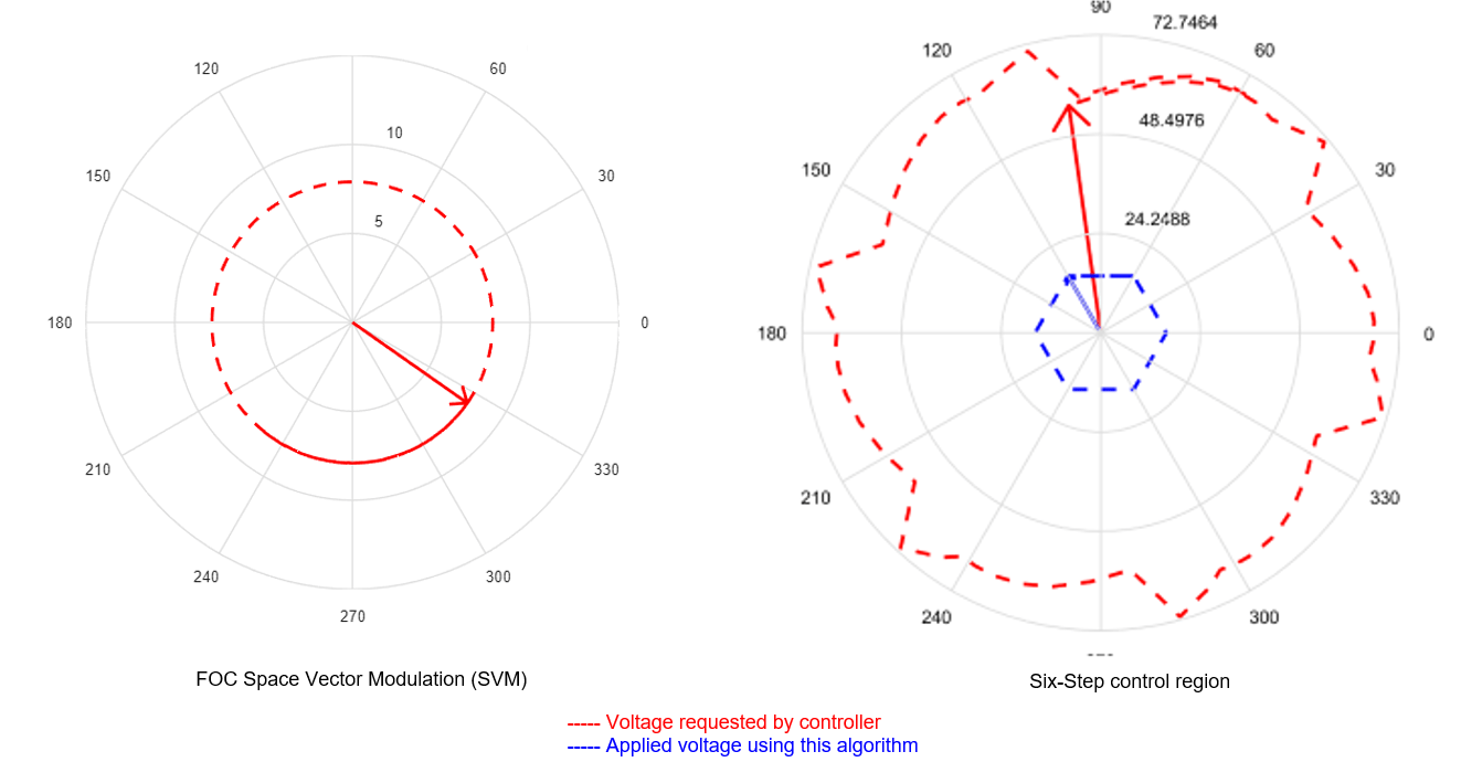The vector plots displays the voltages when running the motor at base speed (with FOC) and above base speed (with six-step).