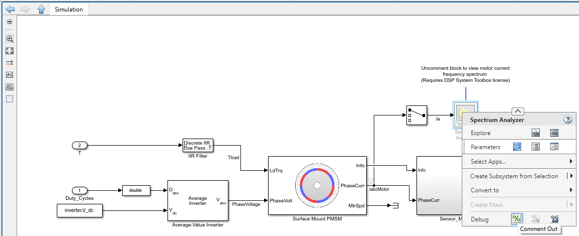 6. Disable the Comment out option for the spectrum analyzer block (to uncomment the spectrum analyzer block) to visualize the frequency spectrum of motor currents during simulation.