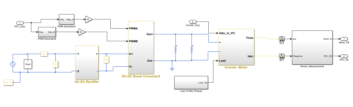 PMSMFOCUsingInterleavedBoostPFC— Simulate, generate code, and load it on the F28069M controlCARD for Motor Load model.PMSMFOCUsingInterleavedBoostPFCHost— Runs on the host computer to log signals for Motor Load Host model.