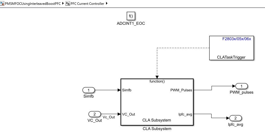 The PFC control algorithm for motor load is implemented inside CLA.