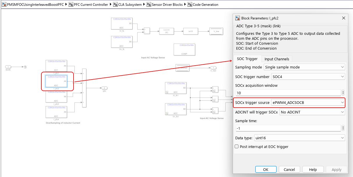 Counter=0for the PWM of PFC whose frequency is 200kHz.PFC total inductor current is sampled at the midpoint of the PWM ON pulse. Since the sampled value represents the average inductor current under CCM (continuous conduction mode) condition. PFC inductor current is also oversampled 4 times during each PWM time period. These 4 sampled values are then used to calculate the average PFC inductor current. The voltage signal conversions are also initiated when the PFC switch is on. The 4 SOC triggers are generated when,