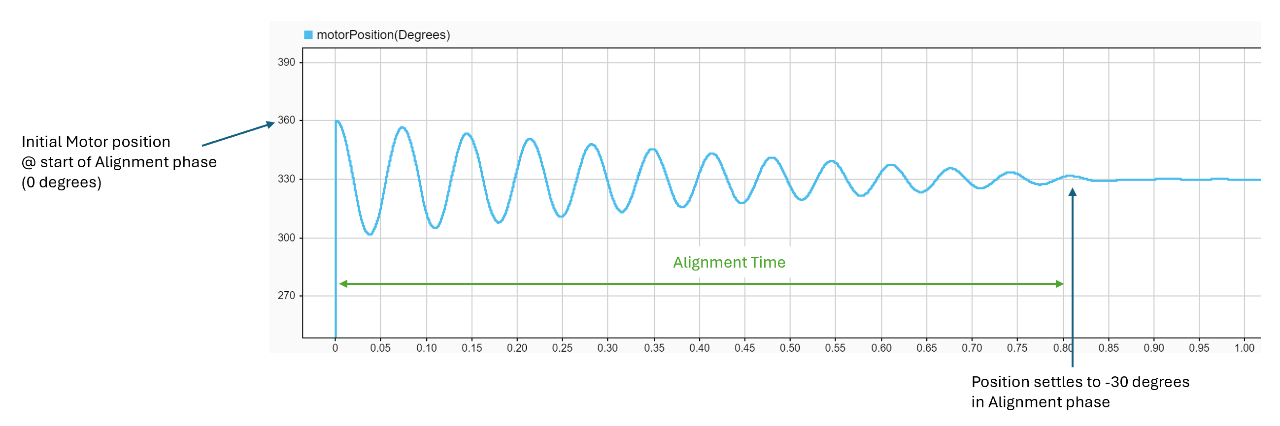 alignmentTimeTemp 는 회전자가 알 수 없는 초기 위치에서 움직이기 시작해 a상을 기준으로 -30도라는 알려진 위치까지 이동하는 데 걸리는 시간입니다. alignmentTimeTemp는 모터 파라미터와 alignmentDutyCycleTemp 변수의 값에 따라 다릅니다.