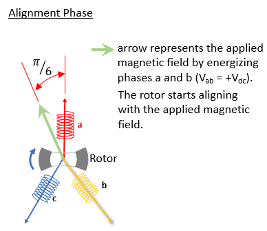 모터 정렬 단계에서 예제 알고리즘은 모터의 두 상(a상과 b상)에 전원을 공급합니다. 결과로 생성되는 자기장으로 인해 회전자가 a상 축에서 30도 위치(전기적 위치)에 정렬됩니다.