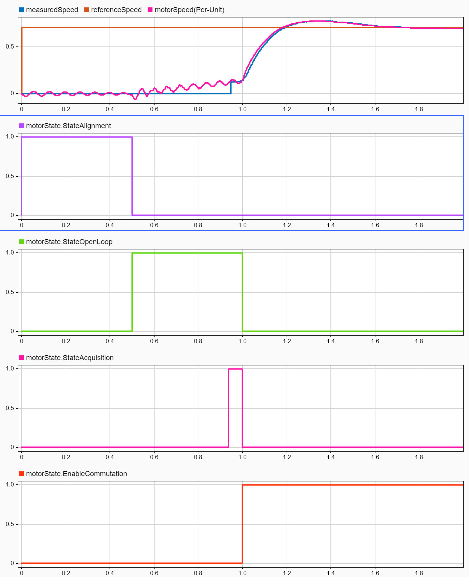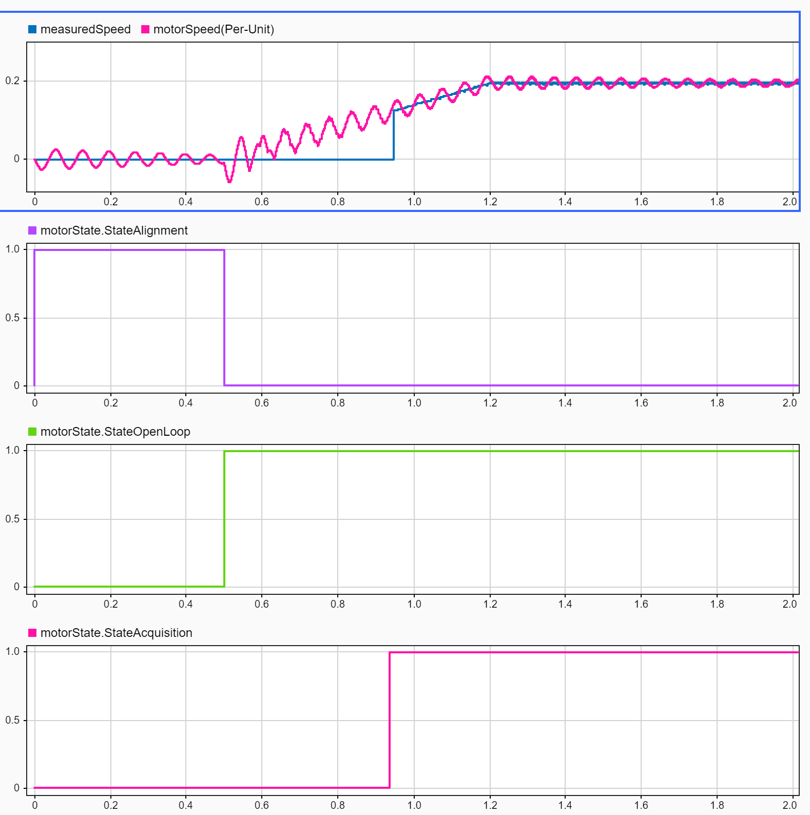 시뮬레이션을 실행한 후 애플리케이션 요구 사항을 충족하는 올바른 값으로 openLoopSpeedForCCTemp 를 수정할 수 있습니다. 이 변수(openLoopSpeedForCCTemp)를 모터 정격 속도의 10%로 설정하는 것이 좋습니다.