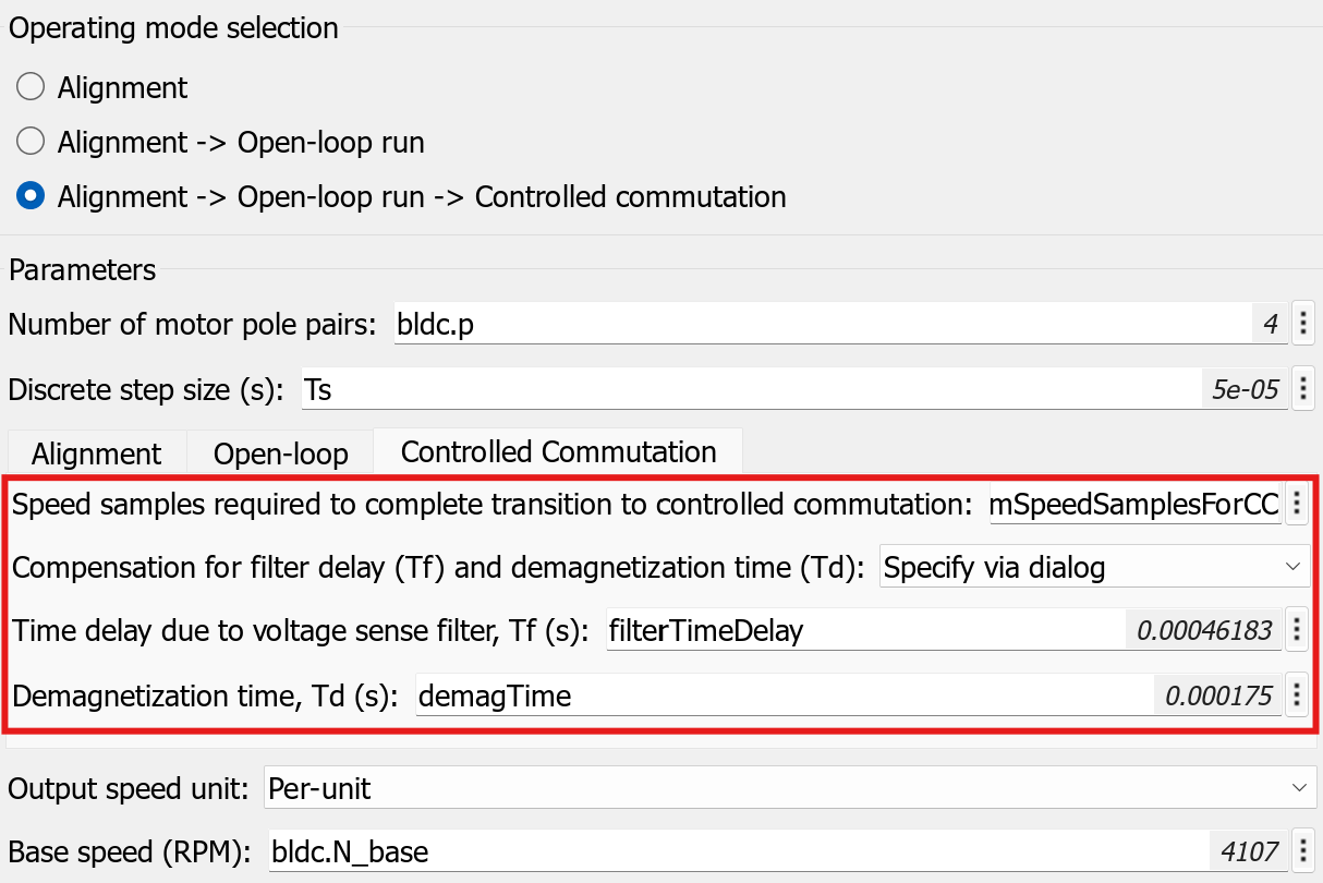 open("BLDCSensorlessSixStepControl.slx"); Mode = 3; % Set Alignment + Open Loop + Controlled commutation mode initialMotorPosition = 0; % Below variables are obtained from previous steps alignmentDutyCycle = alignmentDutyCycleTemp; alignmentTime = alignmentTimeTemp; openLoopDutyCycle = openLoopDutyCycleTemp; targetOpenLoopSpeed = targetOpenLoopSpeedTemp; rampUpTime = rampUpTimeTemp; openLoopSpeedForCC = openLoopSpeedForCCTemp;