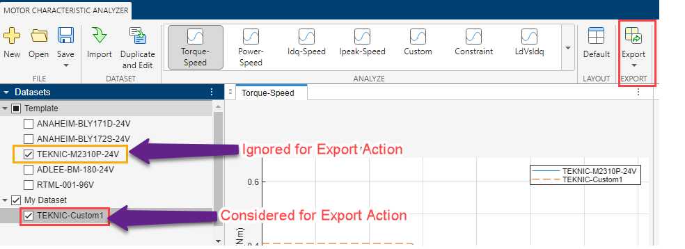 The Motor Characteristic Analyzer app enables you to export data for the dataset that you have currently highlighted in the Datasets pane, into a MAT-file. The three options to export result data are:
