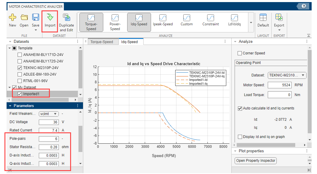 The Motor Characteristic Analyzer app also enables you to import a dataset (MAT-file) and compare the characteristics with an existing template.