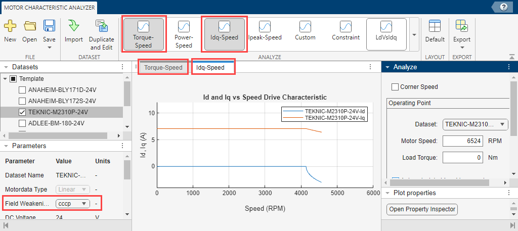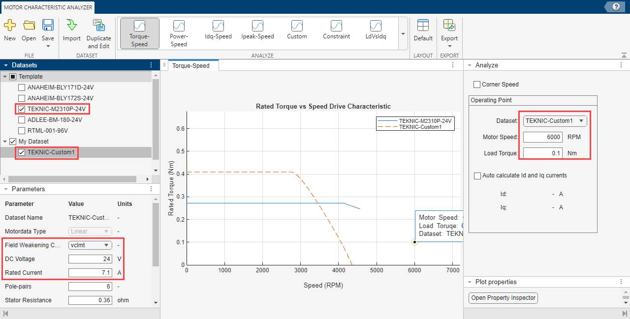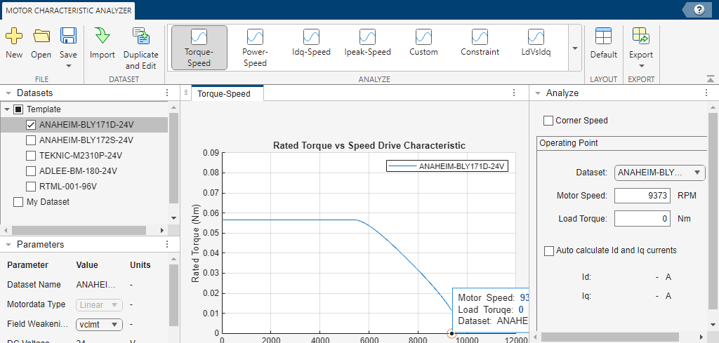 TEKNIC-M2310P-24Vtemplate on the left pane.Click the Torque-Speed icon, available in the Analyze section of the app toolstrip.