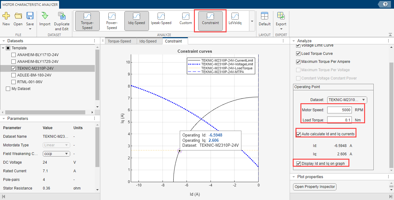 Constraint curves(Id-Iq reference frame) appears in the center pane.In the Operating Point area under the Analyze pane on the right, change the value of Motor Speed to