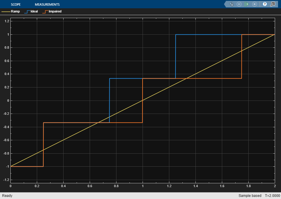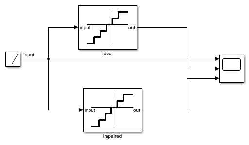 The model has two 4-bit Quantizer blocks connected to the same input signal. The quantizer blocks are identical in every way, but one is label Ideal and the other is labeled Impaired. Initially, none of them have any impairments.