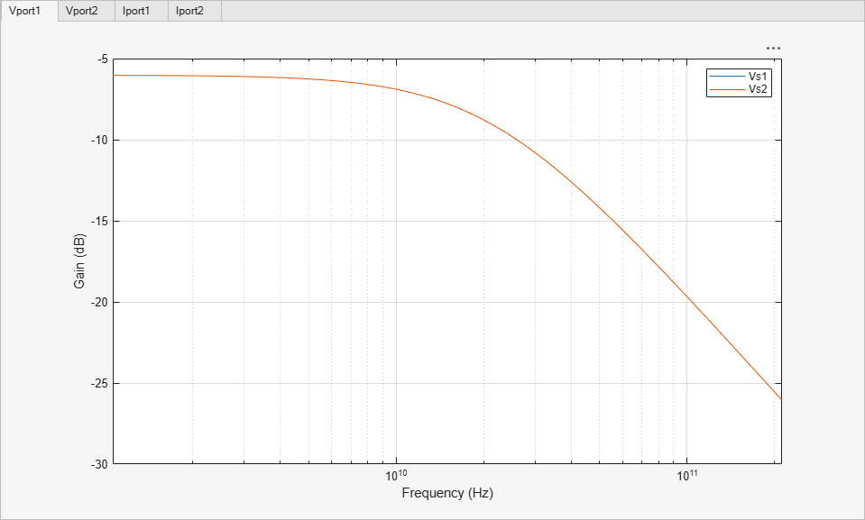 You can calculate the S-parameter data by first defining a desired frequency scale and then using the generateSParameterData helper function provided with this example. It will parse the circuit, export poles and zeros* button, and use them to obtain the S-parameter data from DC to 100 GHz in 1 GHz steps.