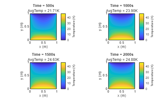 figure; tiledlayout(2,2); for idx = 1:4 nexttile plotTemperature(X,Y,finalSnapshots{idx},snapshotTimes(idx)); end