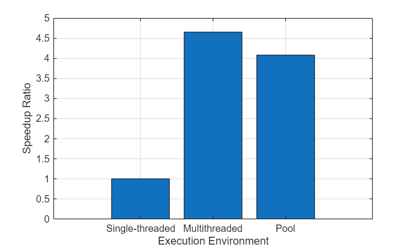 figure; bar(speedupMulti) xlabel("Execution Environment") xticklabels(["Single-threaded","Multithreaded","Pool"]) ylabel("Speedup Ratio") grid on