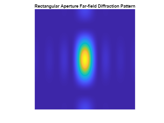 farfieldintensity = real(farfieldsignal.*conj(farfieldsignal)); imagesc(fftshift(farfieldintensity)); axis("equal"); axis("off"); title("Rectangular Aperture Far-field Diffraction Pattern");