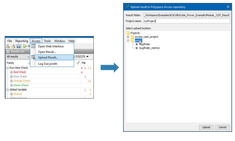 bin\polyspace-access -host hostname -port port^ -upload examples\cxx\Bug_Finder_Example\Module_1\BF_Result