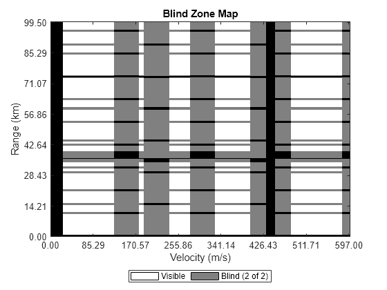 creates a blind zone map BZM = blindzonemap(R,V,PRF,fc,rmin,vmin)BZM for a pulse-Doppler radar transmitting at