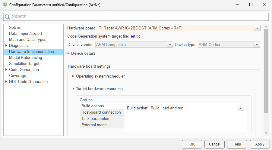3. Set the Hardware board parameter to a value, such as TI Radar AWR1642BOOST (ARM Cortex - R4F).